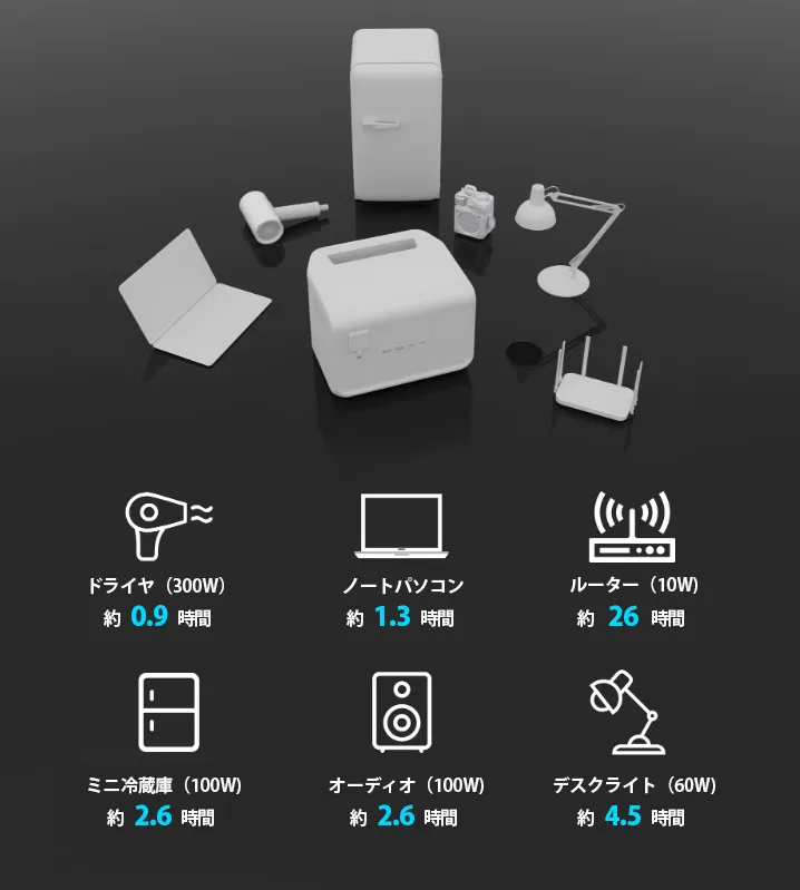 - 防災・非常時の備えに:情報収集のためのノートPCや通信機器、生活家電の電源確保に。