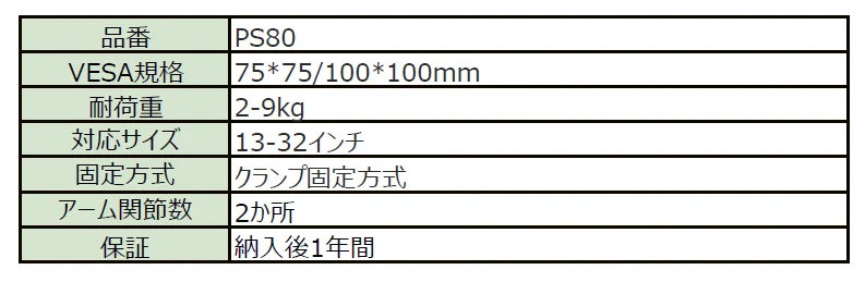 - 耐荷重は2kgから9kgまでのモニターに対応可能